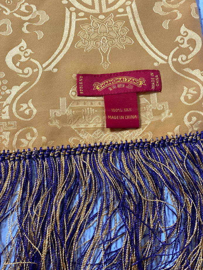 Great condition. Shanghai Tang is known for modernizing classic Chinese design, incorporating traditional prints and motifs into sleek styles. This traditional Chinese printed Jacquard silk scarf in contrasting purple and orange is designed with tassel ends. The scarf itself is reversible and can be worn on either side.