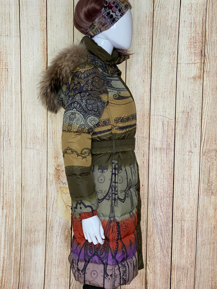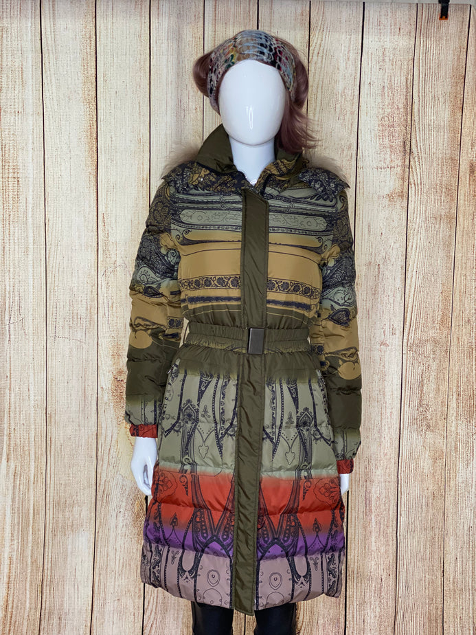 Multi Coloured Fur Hood Belted Down Coat