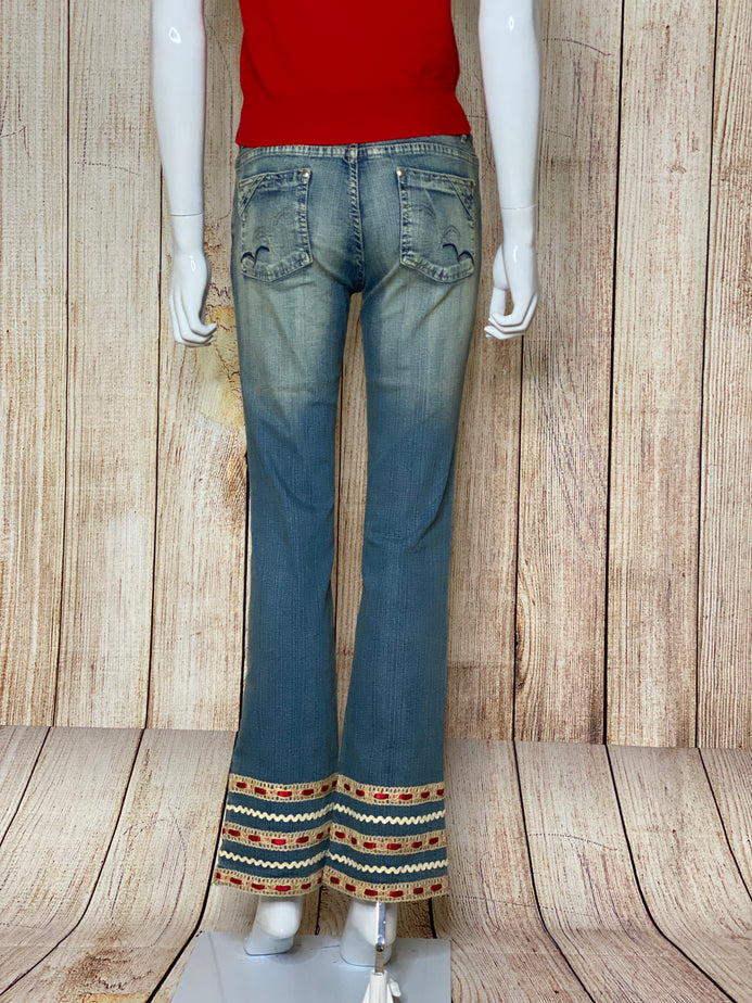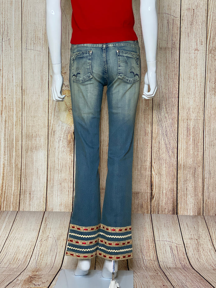 Worn but in good condition. This pair of jeans is very rare and designed by a famous Indian designer who dresses the Bollywood stars.